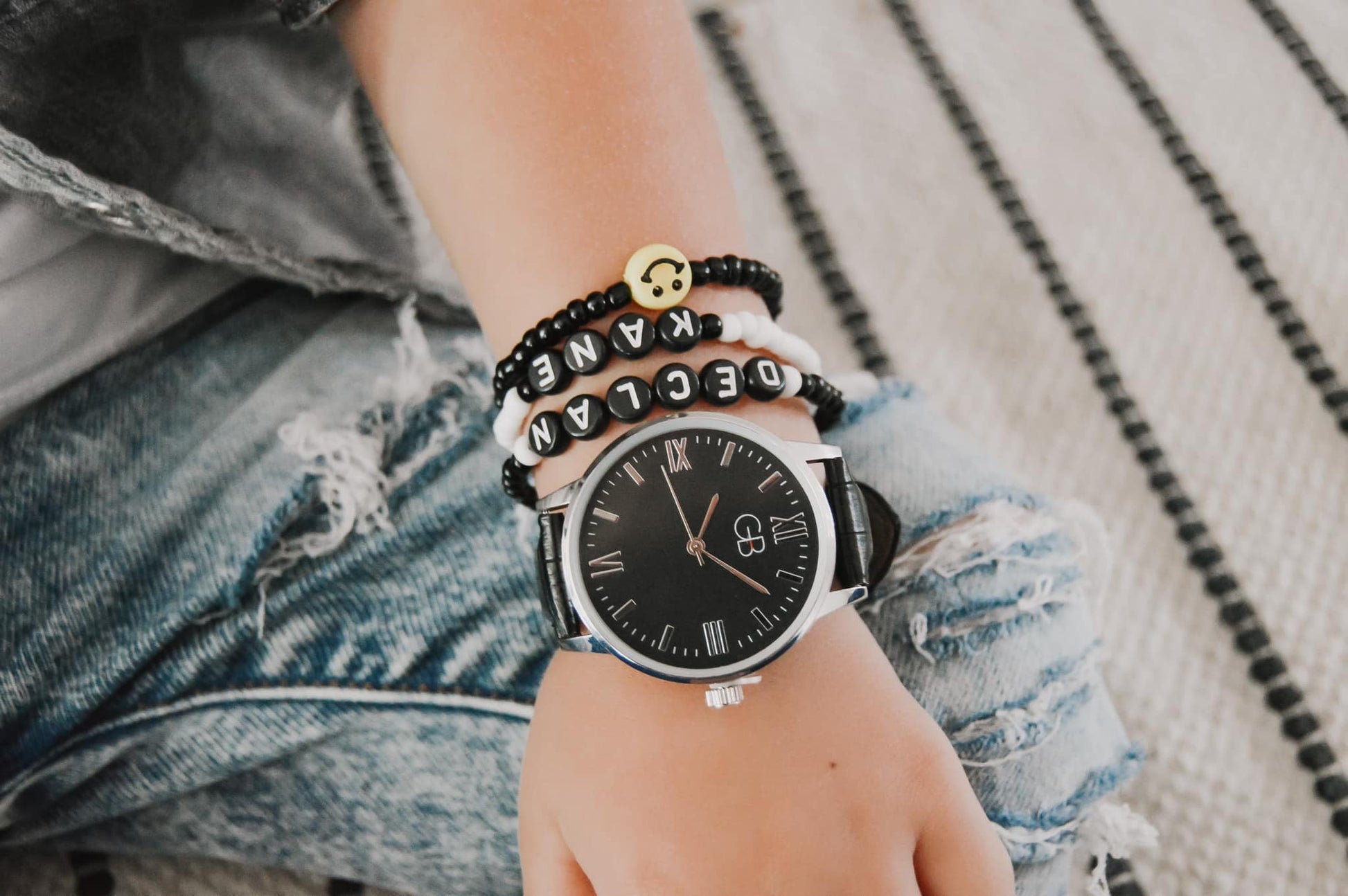 -The White beaded bracelet comes with Black bead accents next to name.