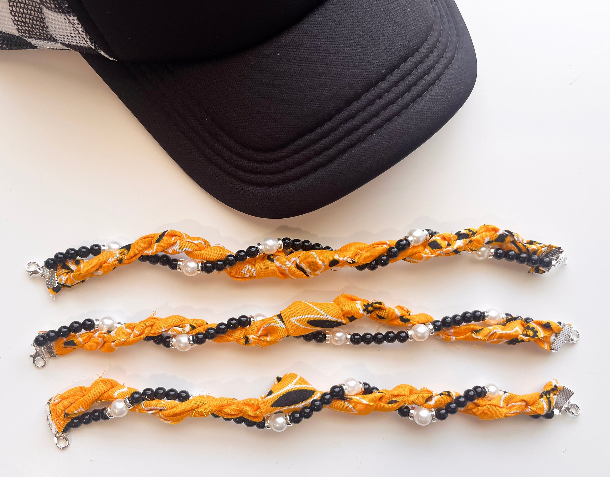 These Hat Chains fit Perfectly Across the Brim of your Trucker Hats and Attach to the MESH Part of the hat with a Lobster Clasp (Already attached to our hat chains)