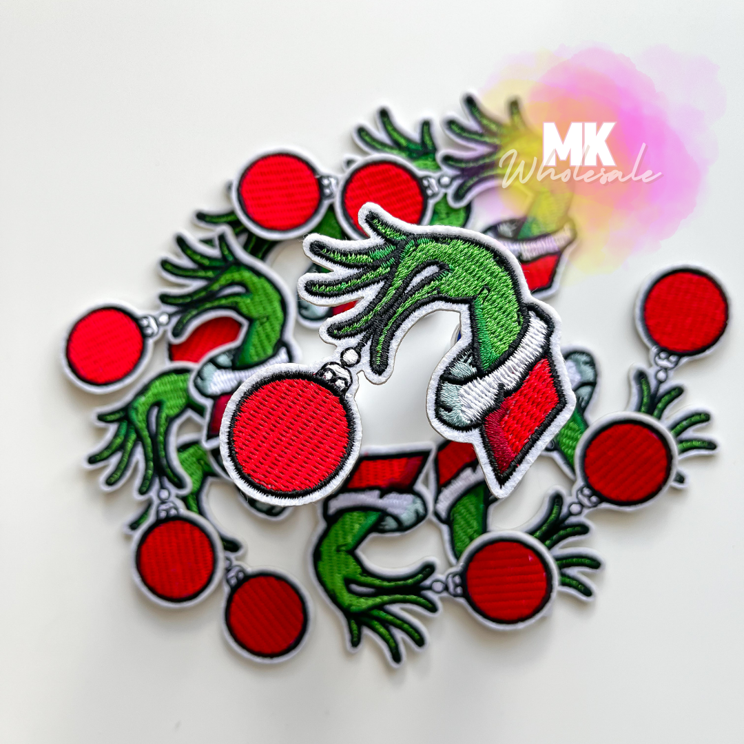 Embroidered Iron on Patch- Grinchy hand with Ornament