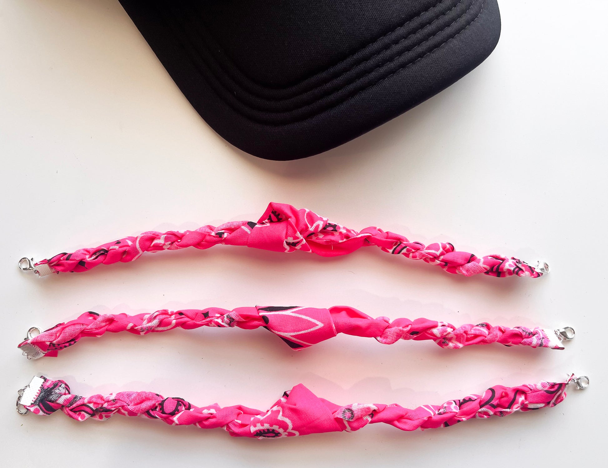 These Hat Chains fit Perfectly Across the Brim of your Trucker Hats and Attach to the MESH Part of the hat with a Lobster Clasp (Already attached to our hat chains)